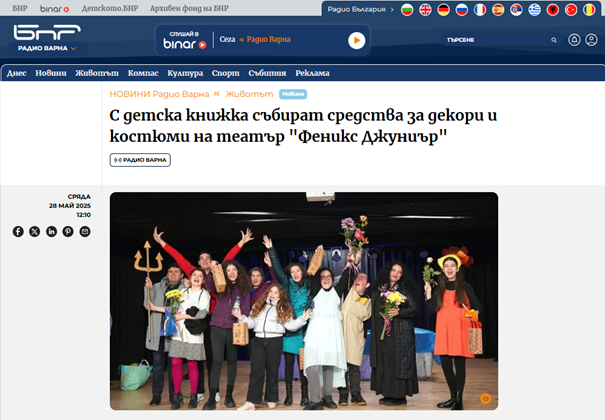 "БНР Варна" от 25.04.2025г., "С детска книжка събират средства за декори и костюми на театър "Феникс Джуниър" https://bnrnews.bg/varna/post/200090/feniks-djuniar