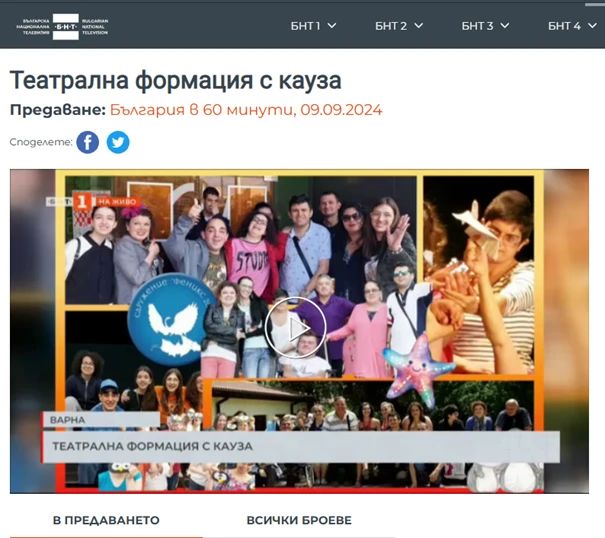 „БНТ – България в 60 минути“ от 9 . 09 .202 4 г., „Театрална формация с кауза” * https://bnt.bg/news/teatralna-formaciya-s-kauza-v373026-331756news.html?fbclid=IwY2xjawF-HLdleHRu A2FlbQIxMQABHb--1uyASizB3lKayJFy4AKGNdOnaKlSupNbtKswuBoxLrVN8Hv-wzdBWw_aem_f39jMENFFKcw44uL6HLqZQ